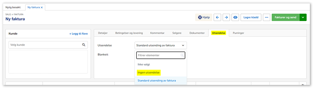 6. Hvis du skal sende en kreditnota og ikke ønsker at kunden skal motta den, kan du under Utsendelse velge bort den aktuelle utsendelsesplanen og velge Ingen utsendelse i stedet. Da vil den ikke sendes ut, men fortsatt føres i regnskapet ditt.