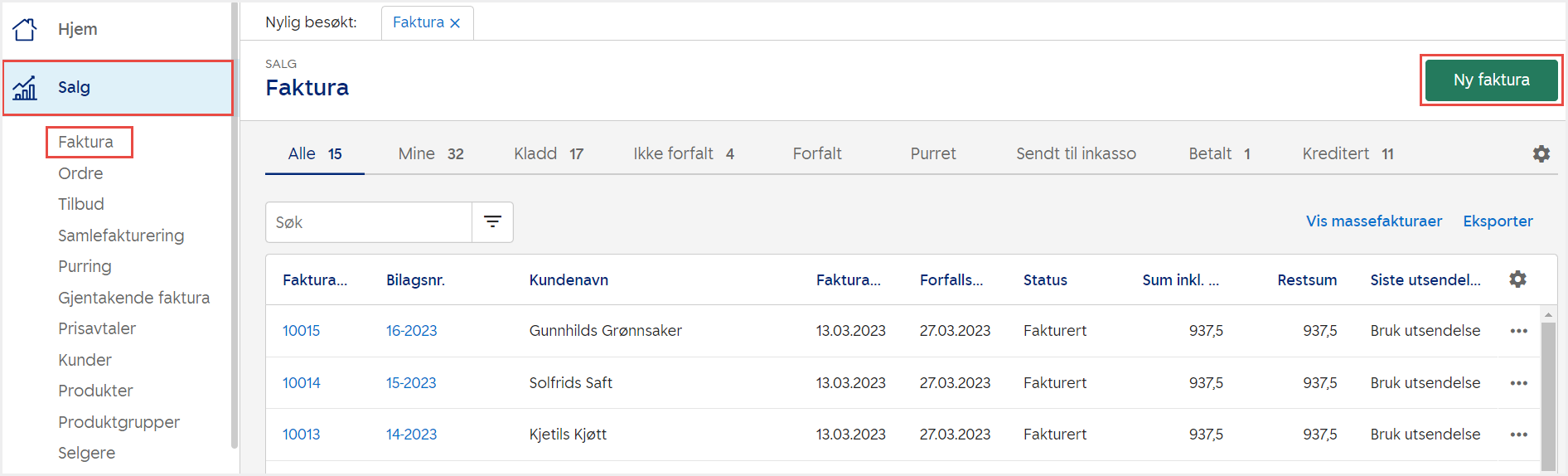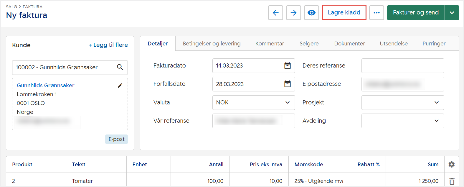 1. Gå til Salg i venstremenyen og velg Faktura. Klikk på Ny faktura og fyll ut informasjon.