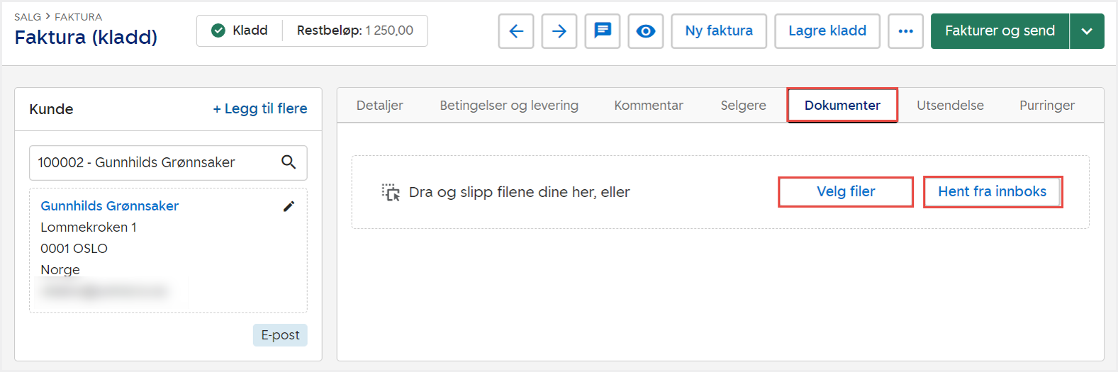 3. Gå til fanen Dokumenter og klikk på Velg filer for å laste opp et dokument lokalt. Klikk på Hent fra innboks for å hente et dokument fra innboksen i regnskapsmodulen.