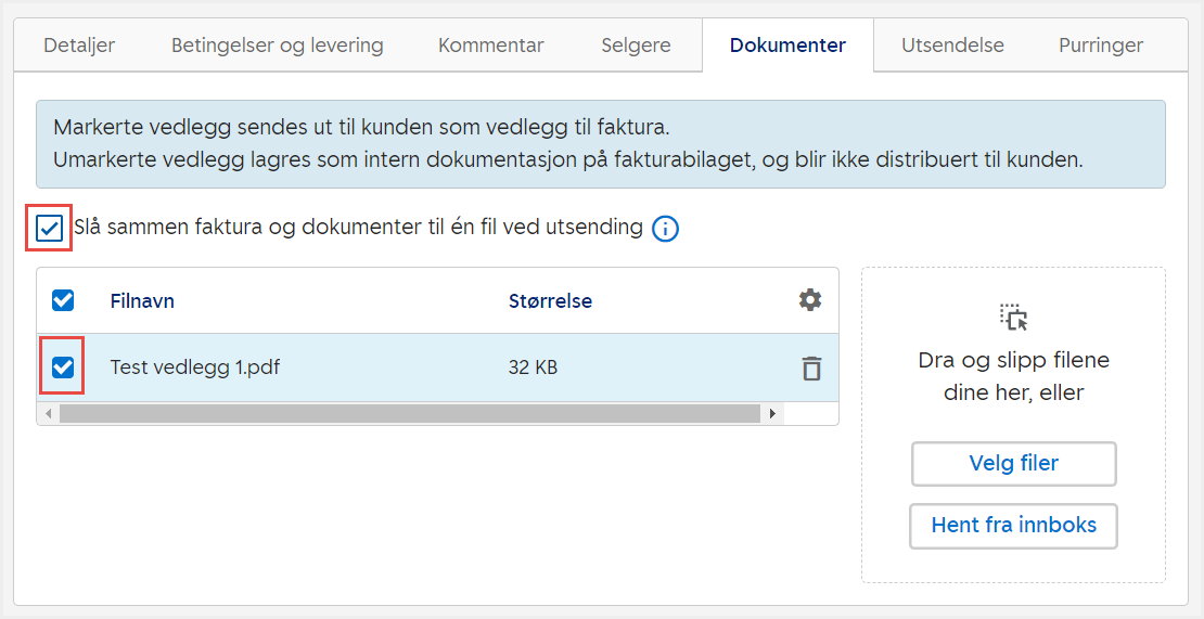 4. Sett hake ved Slå sammen fakturaog dokumenter til én fil ved utsending om ønskelig, og sett hake ved de opplastede dokumentene som skal legges ved fakturaen. Klikk på ikonet for søppelbøtte for å slette et vedlegg. Dersom vedlegget er for stort, får du varsel om at utsendingen vil feile. Maksimal filstørrelse er 10 MB på e-post og 100 MB på EHF.