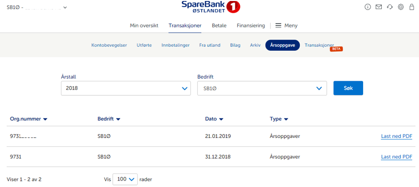 Revisjonsoppgave blir lagret under transaksjoner/årsoppgave i nettbank bedrift.