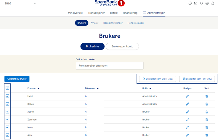 Revisor, med en bruker i nettbank bedrift med tildelte roller og rettigheter som beskrevet over, kan hente ut lister over brukere i nettbank bedrift-avtalen med tilhørende roller og rettigheter på konto. Trykk «Meny» og «Brukere» under menypunktet «Administrasjon». Her kan revisor enkelt eksportere utvalgte eller alle brukere, med tilhørende roller og kontorettigheter, til Excel eller i pdf-format.