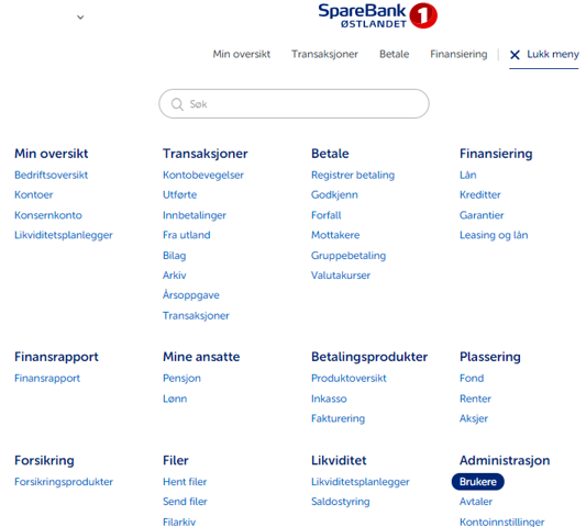 Administrator i nettbank bedrift kan gi revisor tilgang til selskapets nettbank bedrift-avtale slik at revisor kan hente ut nødvendig dokumentasjon som revisjonsoppgaver, årsoppgaver, samt få innsyn i kontoer etc. Trykk på "Meny" og "Brukere" under menypunktet "Administrasjon".
