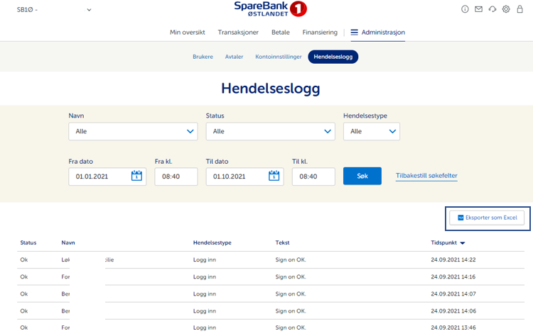 Trykk på «Meny» og «Hendelseslogg» under menypunktet «Administrasjon». Her kan revisor se på hva brukere og administrator har foretatt av innlogginger og betalinger, samt se om det er gjort endringer på brukere, lagt opp nye brukere eller slettet brukere. Oversikten kan også eksporteres til Excel.