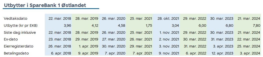 SpareBank 1 Østlandet legger vekt på å gi sine eiere et konkurransedyktig og stabilt kontantutbytte, basert på god lønnsomhet og høy utbyttekapasitet. Banken har som mål å utbetale minst 50 prosent av hvert års konsernoverskudd etter skatt og minoritetsinteresser, som utbytte til egenkapitalbeviseierne og som kundeutbytte fra grunnfondskapitalen. Utbyttebeslutningen skal vurderes i lys av eventuelle ekstraordinære inntekts- og kostnadsposter, samt hensynta forventet resultatutvikling og regelverksendringer med ventet konsekvens for kapitaldekningen.