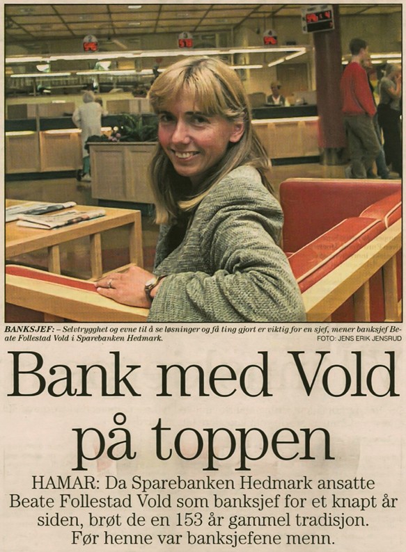 Beate Follestad Vold blir den første kvinnelige banksjefen i Sparebanken Hedmark når hun i 1998 tiltrer som banksjef for privatmarkedet i Hamar.