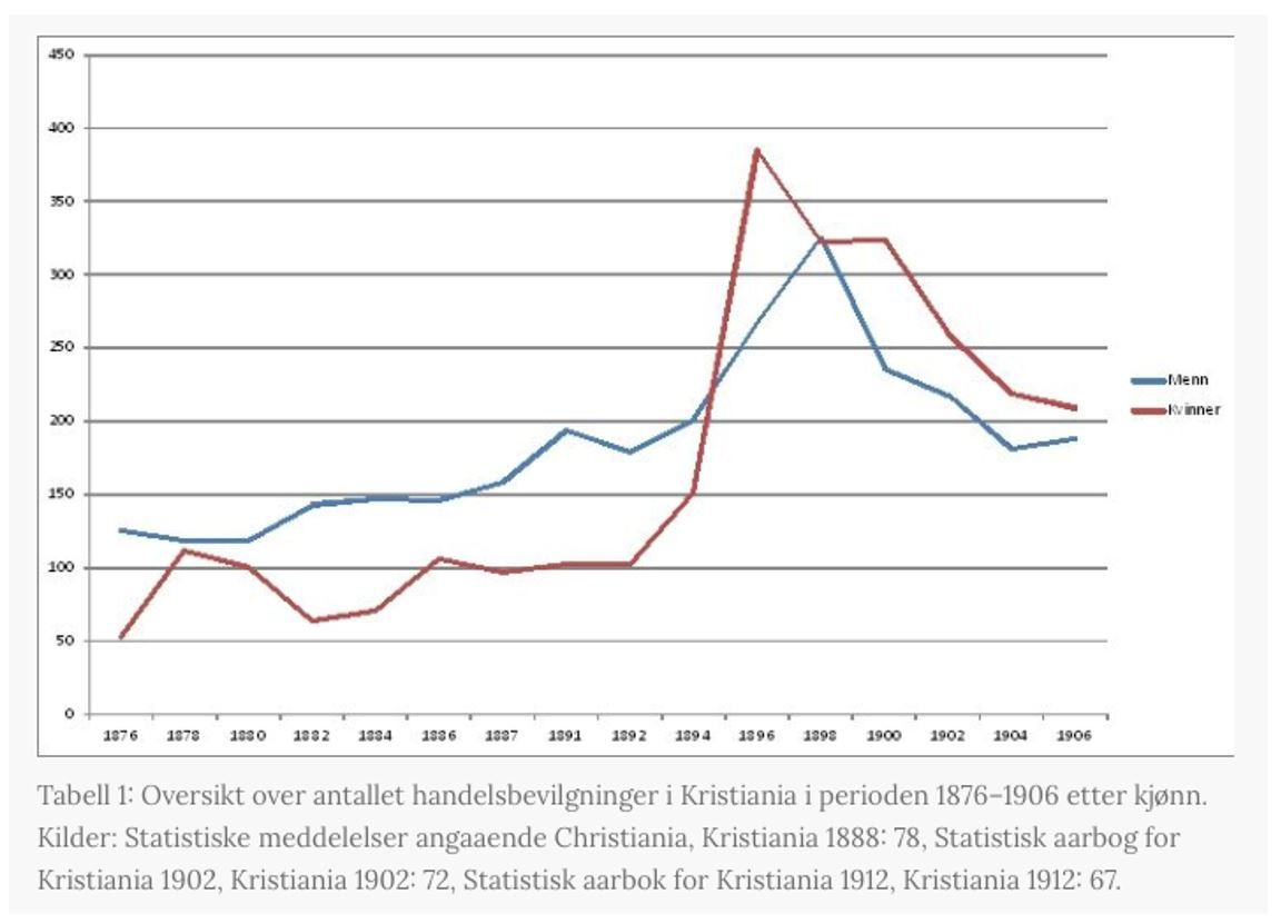 Kvinner er aktive i næringslivet på andre halvdel av 1800-tallet, til tross for at de ikke får full næringsfrihet før i 1894. Et eksempel er Benedicte Lyng, hvis lønn som lærerinne ikke lenger strekker til når hun på 1890-tallet blir skilt med to barn å forsørge. På denne tiden er en drøy tredjedel av norske kvinner yrkesaktive. Yrkesprosenten for kvinner er stabil på rundt 35 prosent fra 1875 til 1900, før den begynner å falle jevnt og trutt fram til 1960. Det er i hovedsak ugifte kvinner som tar lønnsarbeid utenfor hjemmet.