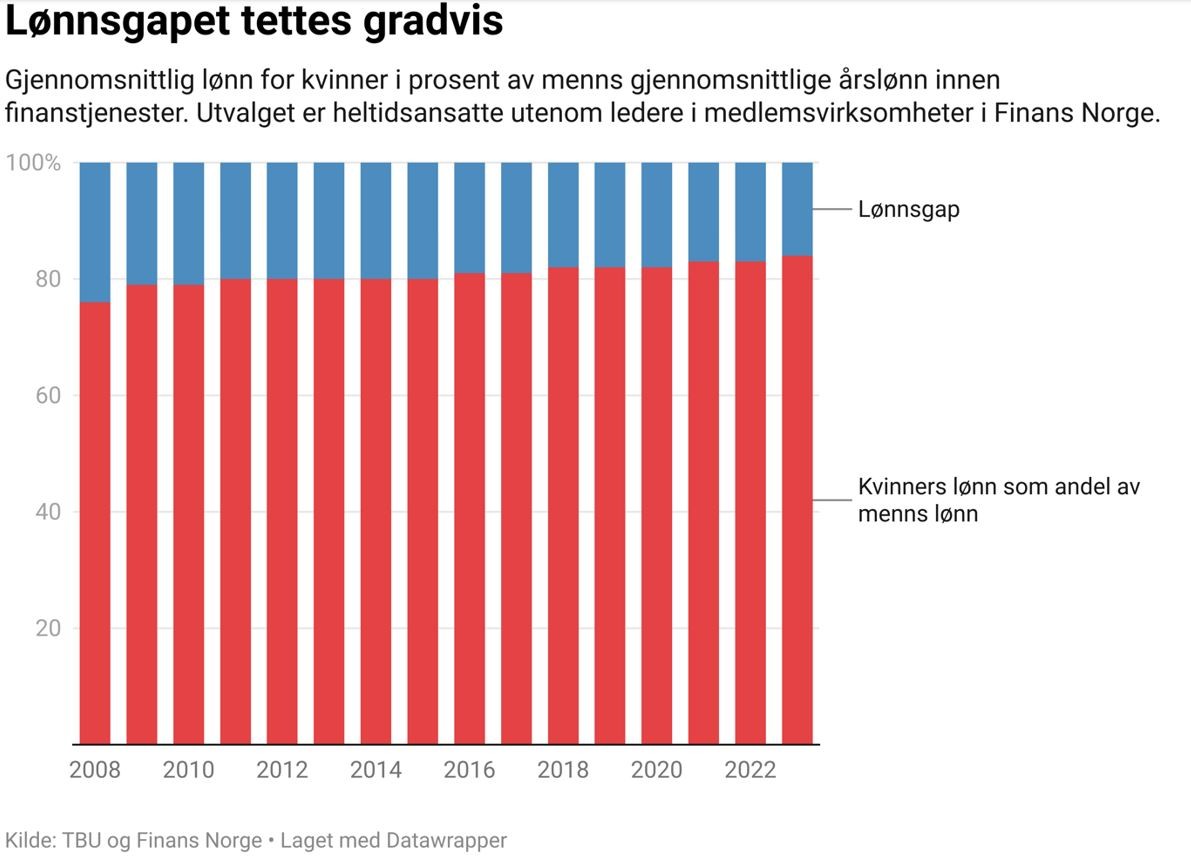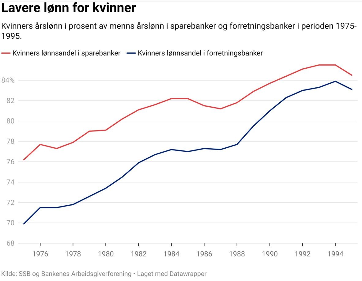 På topp i 1994 utgjorde kvinners årslønn 84 prosent av menns årslønn for sparebanker og forretningsbanker samlet. Det er det samme lønnsgapet som vises for 2023 i diagrammet nedenfor, som er hentet fra Finans Norge.