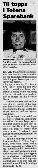Åshild Lundgaard blir første kjente kvinnelige leder av et forstanderskap i SpareBank 1 Østlandets historie når hun i 1995 blir «formann» i Totens Sparebank.