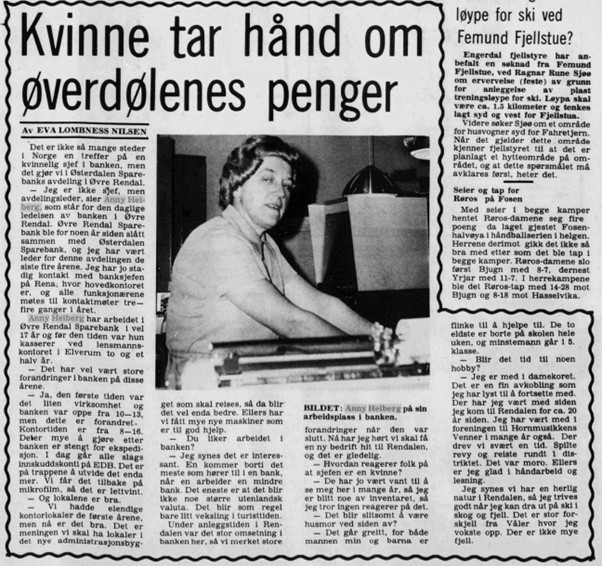 Anny Heiberg blir avdelingsleder i Østerdalen Sparebank i 1971, en av Sparebank 1 Østlandets opprinnelige sparebanker. “Kvinne tar hånd om øverdølenes penger”, er overskriften på en etterfølgende avisartikkel. Der sier hun: “Jeg er ikke sjef, men avdelingsleder”.