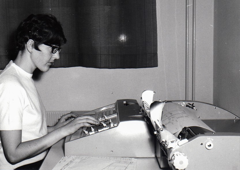 Sigrid Roland i Aamot Sparebank var en av kvinnene som begynte å jobbe i bank rundt denne perioden. På bildet ser vi henne ved en bokholdermaskin på Rena mot slutten av 1960-tallet. Der gjør hun et rutinepreget arbeid som var typisk for kvinner i bank i mange tiår.