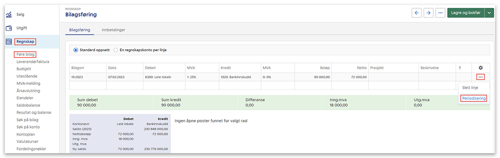 5. Trykk Lagre og bokfør for det manuelle bilaget slik at periodiseringen bokføres.