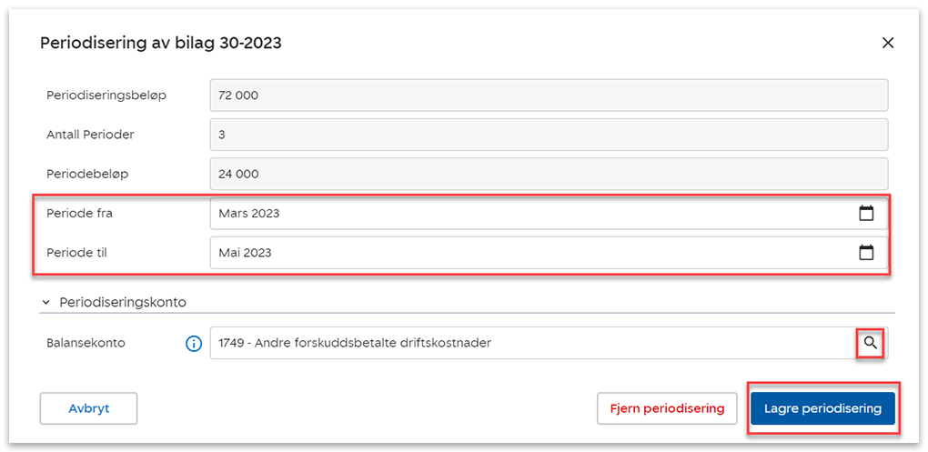 3. Legg inn Periode fra, Periode til og Balansekonto som du ønsker å bruke til å periodisere bilaget. Dersom du skal periodisere fremover i tid kan du bruke en konto i gruppe 17, og skal du periodisere tilbake i tid kan du bruke en konto i gruppe 29.