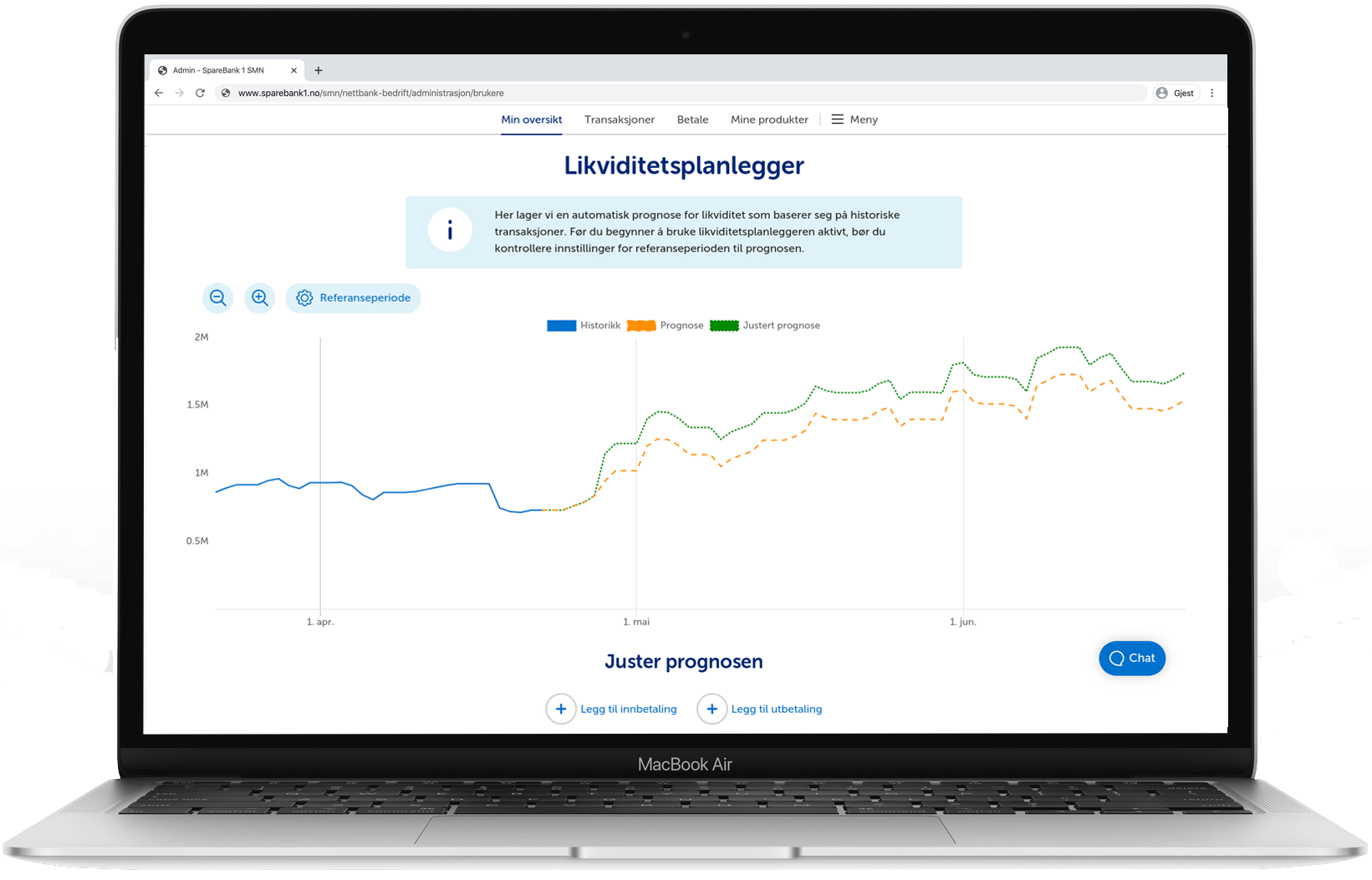 Likviditetsplanleggeren bruker tidligere data til å forutse likviditet fremover i tid, og gjør det enklere for bedriften å unngå likviditetsproblemer på lang sikt. Du kan også legge inn forventede kostnader eller inntekter, og dermed få et godt økonomisk bilde av bedriften.
