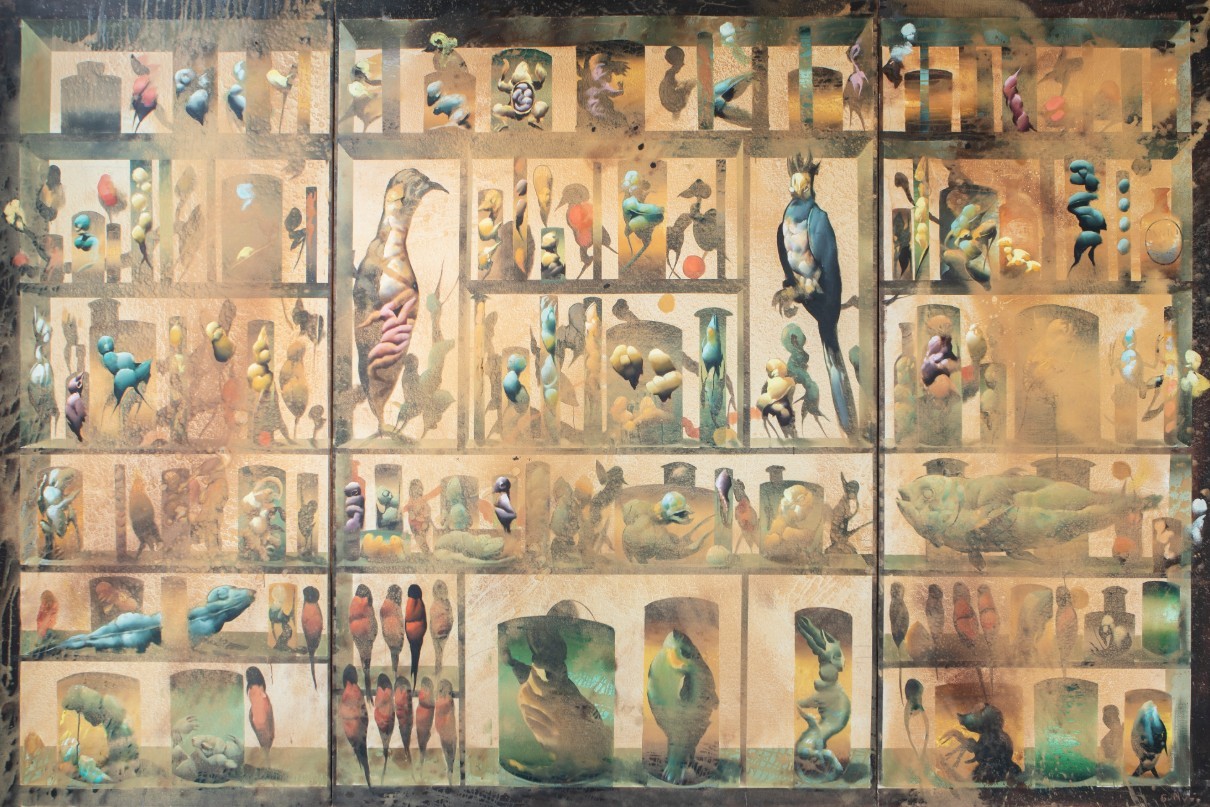 Oljemaleriet Samlingen viser ulike objekter plassert på rekke og rad i et hyllesystem, nærmest som en settekasse. Det kan minne om et naturvitenskaplig museumsmagasin med utstoppede fugler og ulike skapninger i formalin.