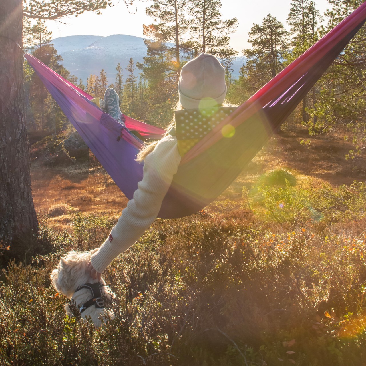 - Ønsker du enda mer isolering er det deilig å legge et ullteppe, eller et reinskinn/saueskinn under kroppen som du kan bre opp langs kanten av hengekøyen, sier hun.