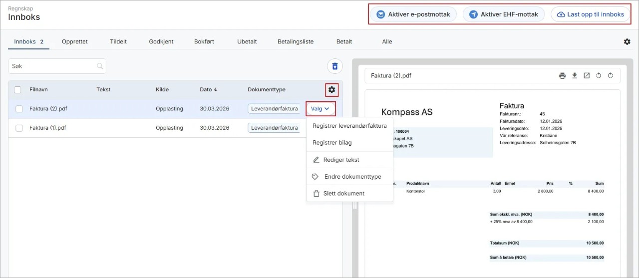 Du kan aktivere e-postmottak og EHF-mottak direkte fra innboksen dersom dette ikke allerede er gjort. Du kan også laste opp filer direkte til innboksen fra din PC.