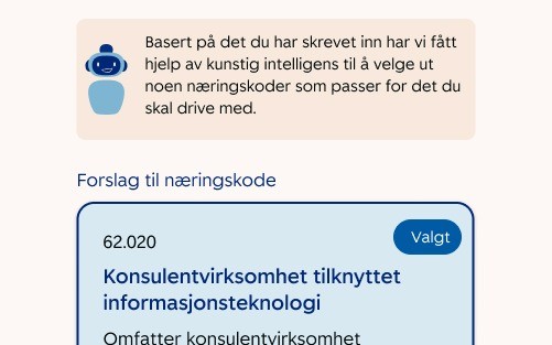 Nå er et av de første stegene å finne riktig næringskode, og det kan være en barriere for å komme videre. Vi ser på om vi kan flytte dette litt lenger bak, slik at det du fyller ut først er enklere å svare på, samtidig som vi får bedre data til KI-promptet som kan foreslå riktig næringskode til deg.