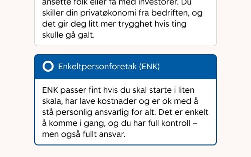 Når du jobber med å bestemme deg for alt det formelle rundt å starte bedrift, gir vi deg nå en kort intro om fordeler og ulemper med aksjeselskap (AS) og enkeltpersonforetak (ENK) og du kan velge det som passer deg best. Vi sørger for at resten av Startstreken tilpasser seg til det valget du gjør.