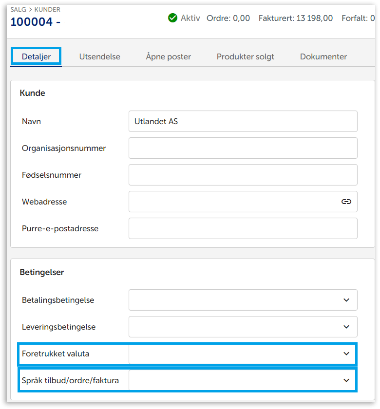 Endrer du valuta på kundekortet, kommer det opp på fakturaen. Du kan også velge å endre valuta når du opprette fakturaen.