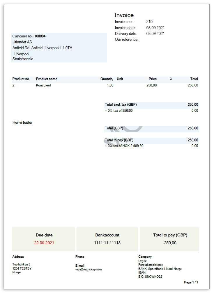 En faktura til utlandet får automatisk IBAN og BIC nederst i høyre hjørne. Se eksempel under.