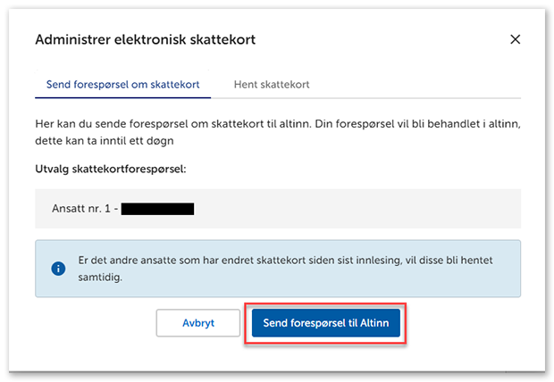 3. Klikk på Send forespørsel til Altinn. Vær oppmerksom på at systemet også henter endrede skattekort på andre ansatte, og i noen tilfeller kan også ansatte med sluttdato få oppdatert skattekort.