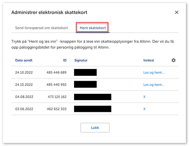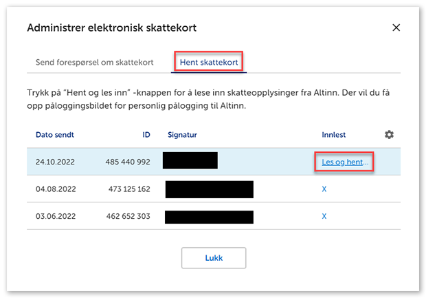 4. Velg fanen Hent skattekort og klikk Les og hent inn.