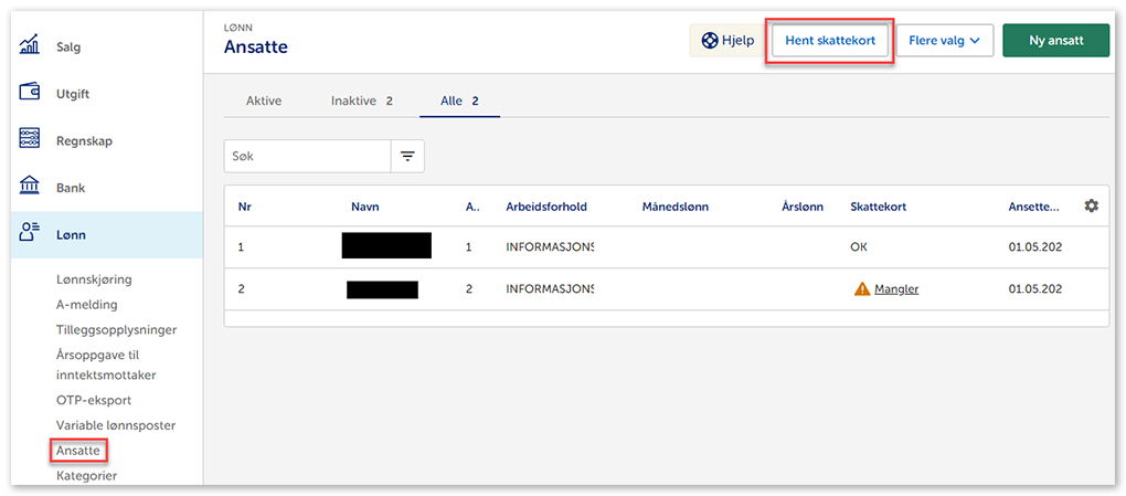 1. Gå til Lønn i venstremenyen og velg Ansatte. Klikk på Hent skattekort.