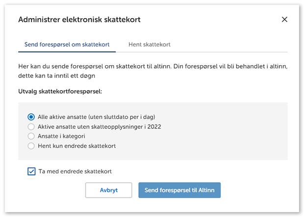 - Hent kun endrede skattekort: Kun ansatte som har endret skattekortet siden forrige henting.
