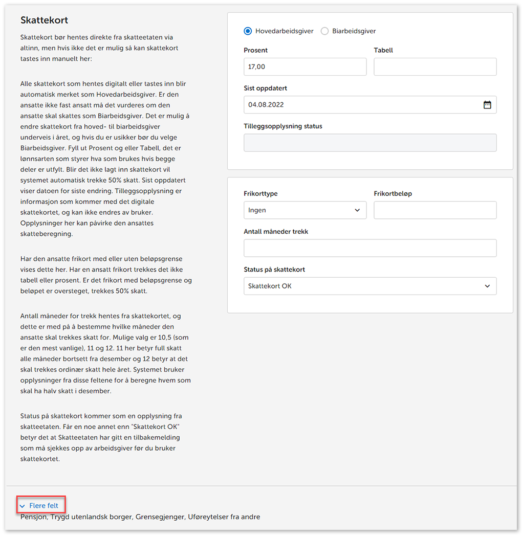 7. Klikk på Flere felter dersom den ansatte skal ha Pensjonsskattekort, Trygd utenlandsk borger, Grensejeger- eller Uføre-skattekort.