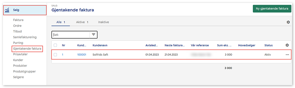 1. Gå til Salg i venstremenyen og velg Gjentakende faktura. Velg aktuell gjentakende faktura.
