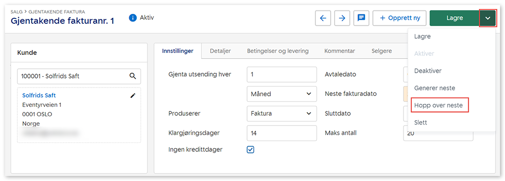 2. Klikk på nedtrekkslisten til høyre for Lagre og velg Hopp over neste. Faktura som skulle blitt generert ved neste fakturadato vil da bli hoppet over og ikke generert.
