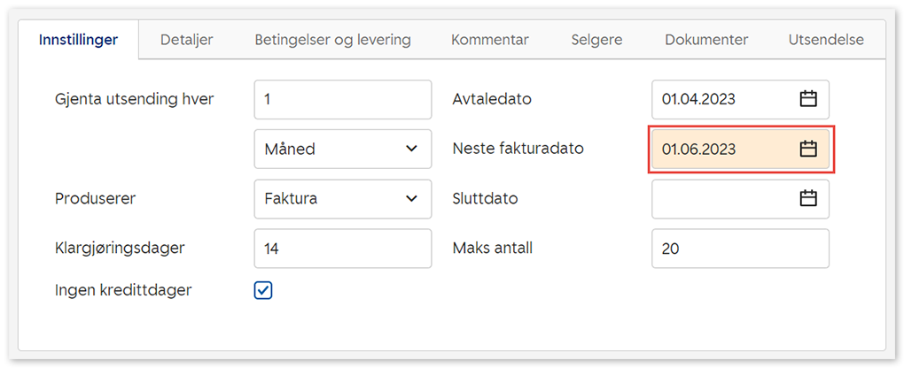 3. Sett Neste fakturadato til datoen faktura skal begynne å genereres igjen, hvis du skal fryse eller utsette faktura for en bestemt periode.