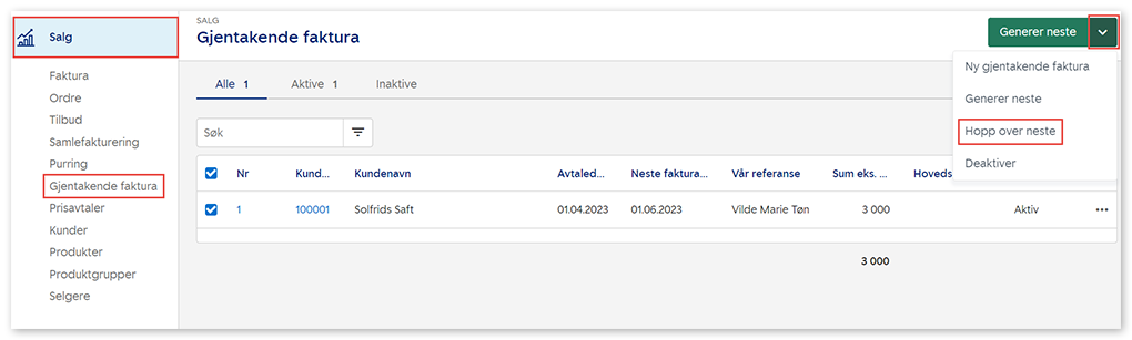 For å hoppe over neste faktura direkte fra fakturalisten går du tilbake til Salg og Gjentakende faktura. Sett hake ved aktuelle fakturaer, klikk på nedtrekkslisten til høyre for Generer og velg Hopp over neste.