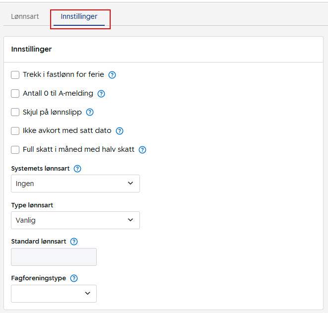 • Systemets lønnsart: Lønnsarter som systemet bruker som standard til blant annet skatt, feriepenger, forskudd og lignende. Merk at du kun kan legge på en lønnsart om gangen med hver av systemets lønnsarter.