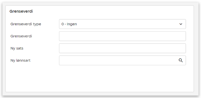 • Ny lønnsart: Hvis det er lønnsarten som skal endres etter at grenseverdien er oppnådd fyller du inn lønnsartnummeret til den nye lønssarten her.