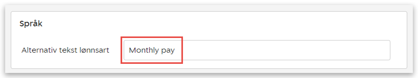 Hvis du sender lønnsslipp på engelsk, i tillegg til norsk, kan du legge inn det engelske navnet på lønnsarten her. Dette vil være synlig på lønsslippen.