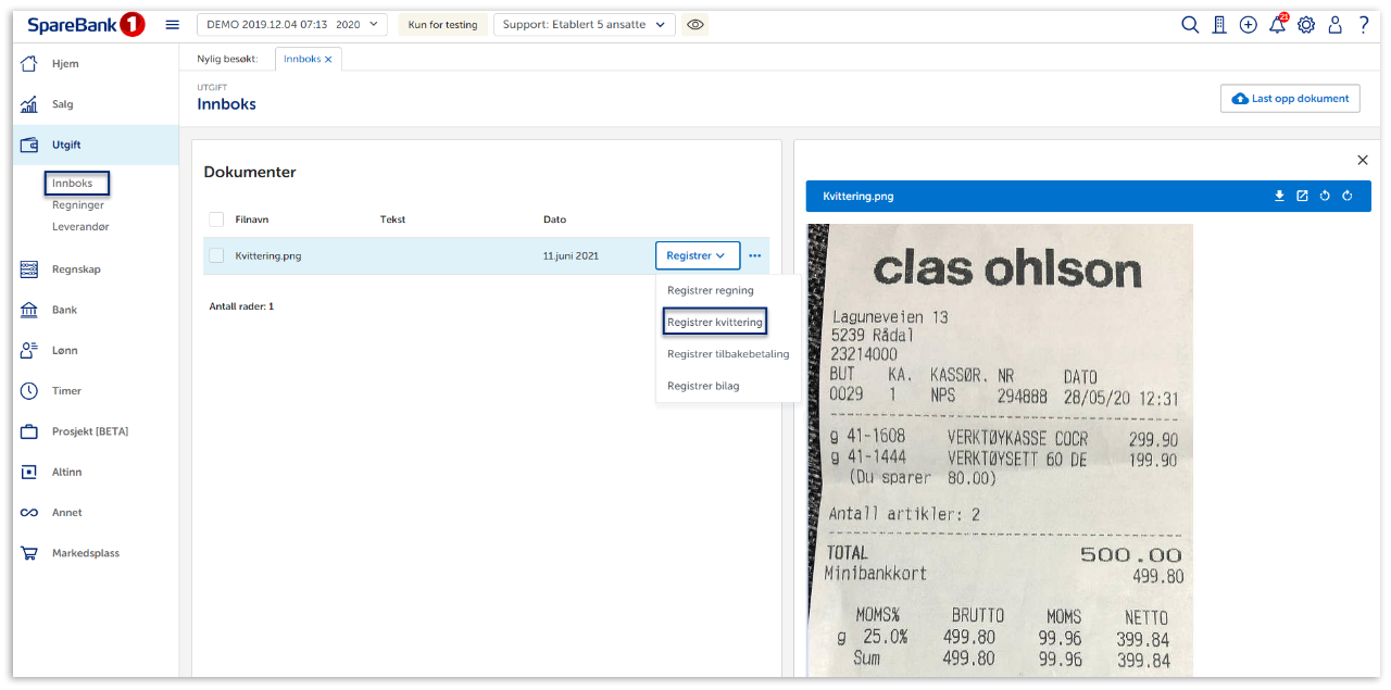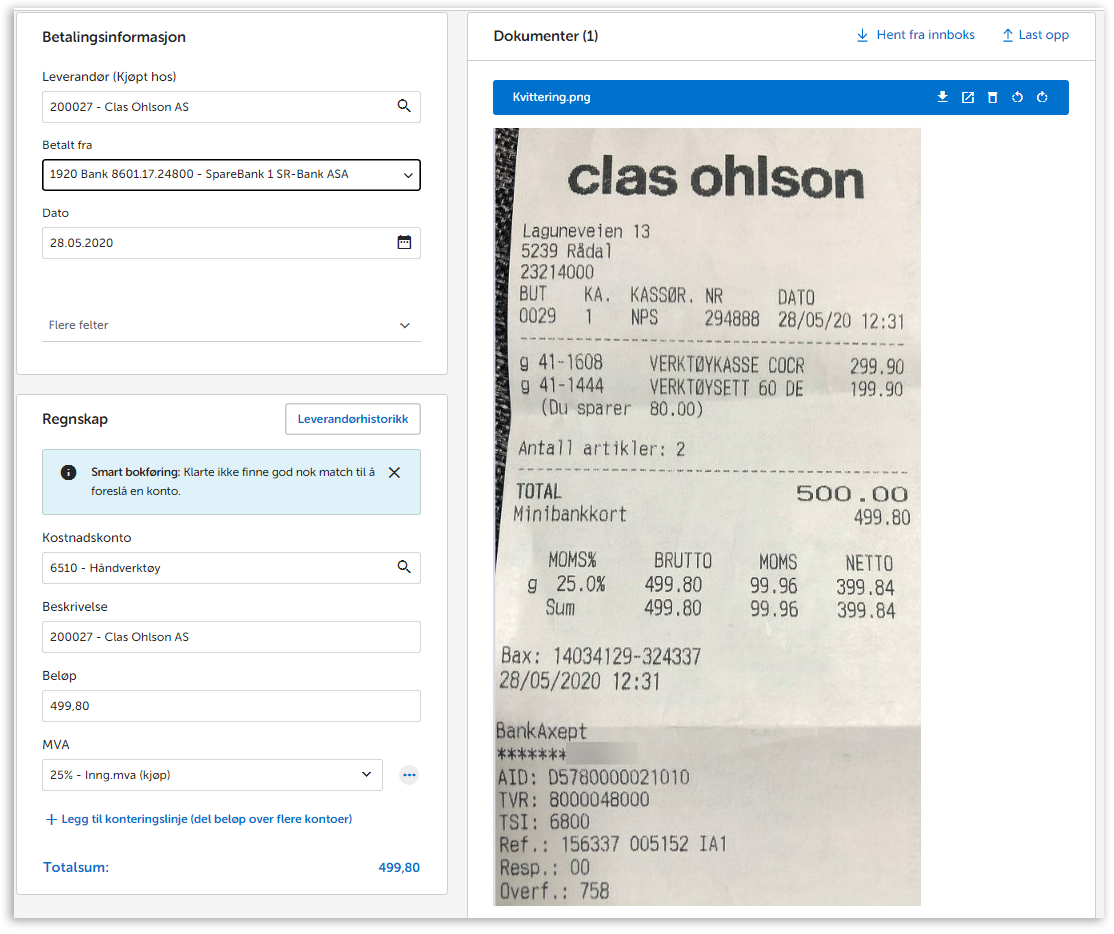 5. Trykk på Bokfør. Når kvitteringen er bokført blir den tildelt et bilagsnummer.