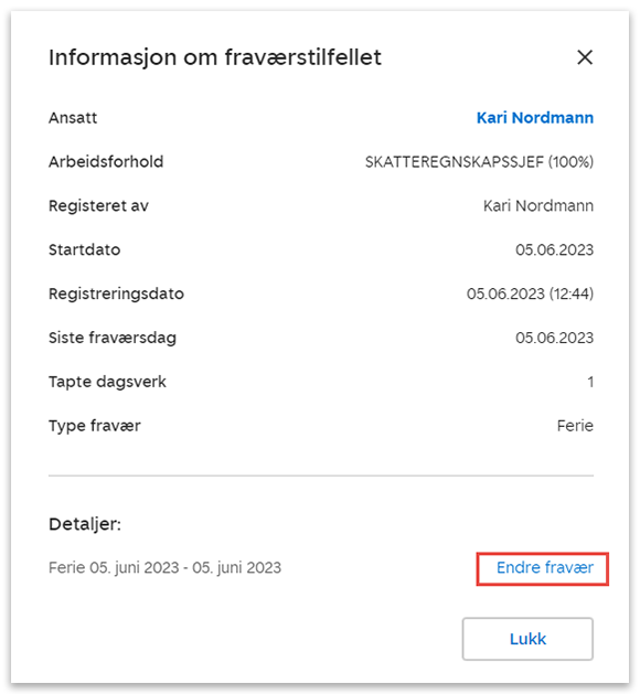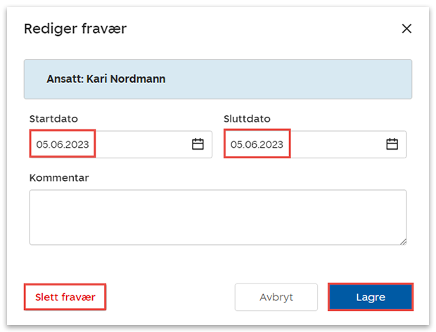 5. Endre datoer og klikk på Lagre hvis du vil endre ferien. Klikk på Slett fravær for å fjerne ferien.