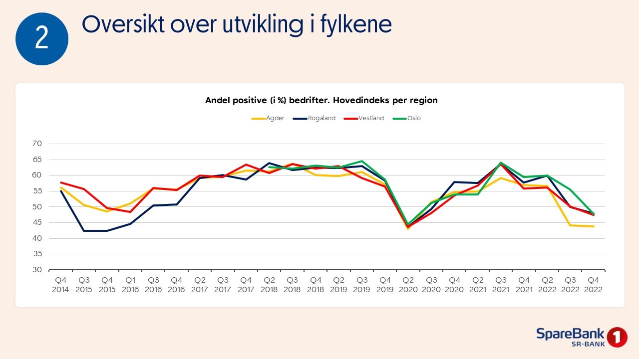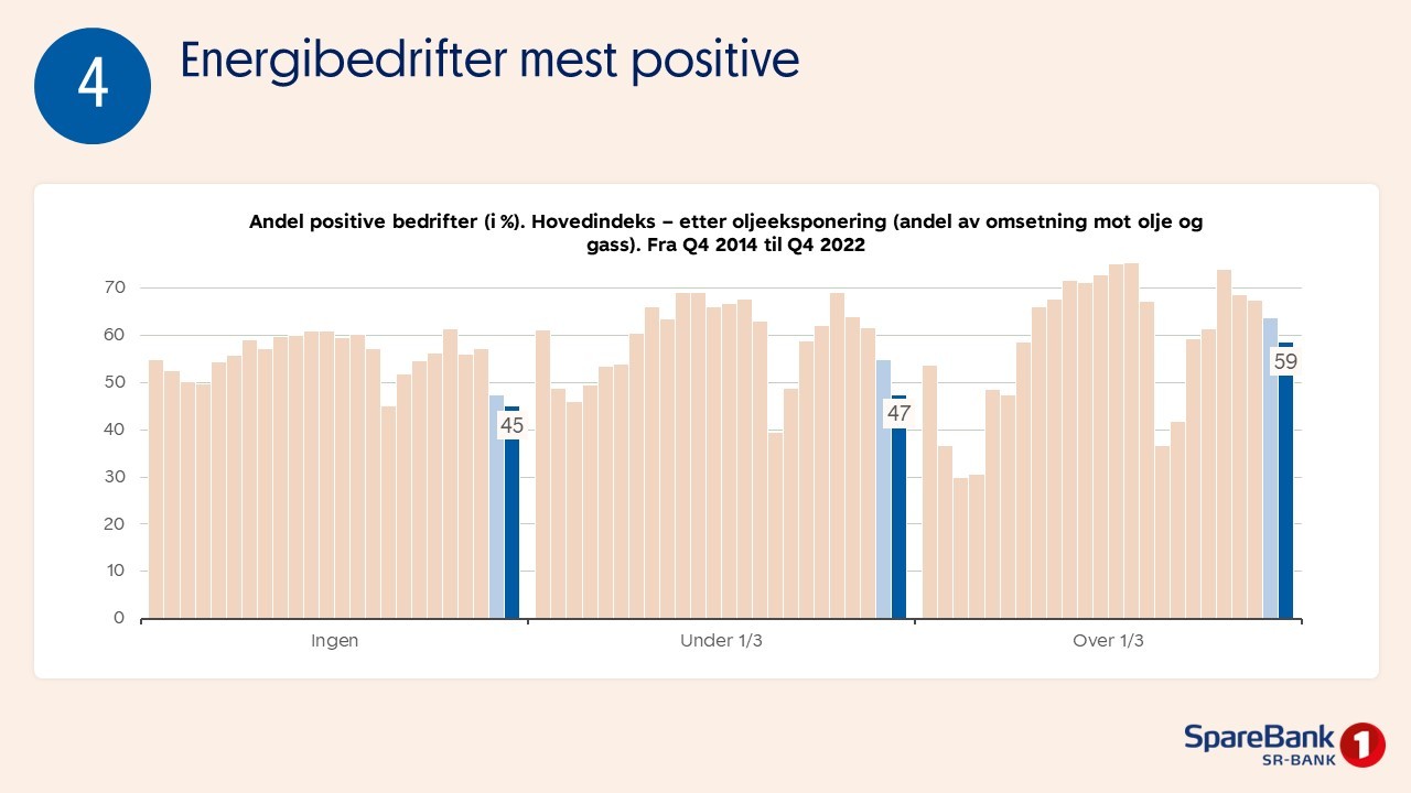 Er indeksen på 50 prosent, er det like mange positive som negative bedrifter. Er den høyere enn 50 prosent, er det overvekt av positive bedrifter.