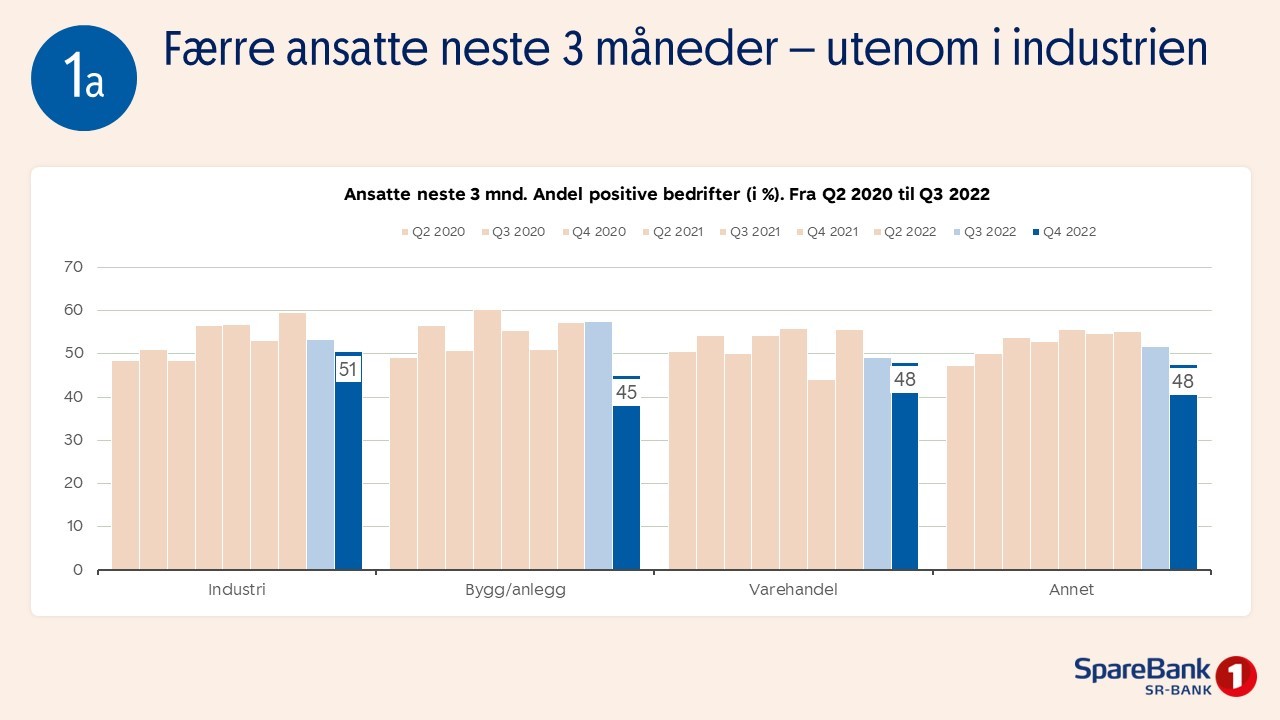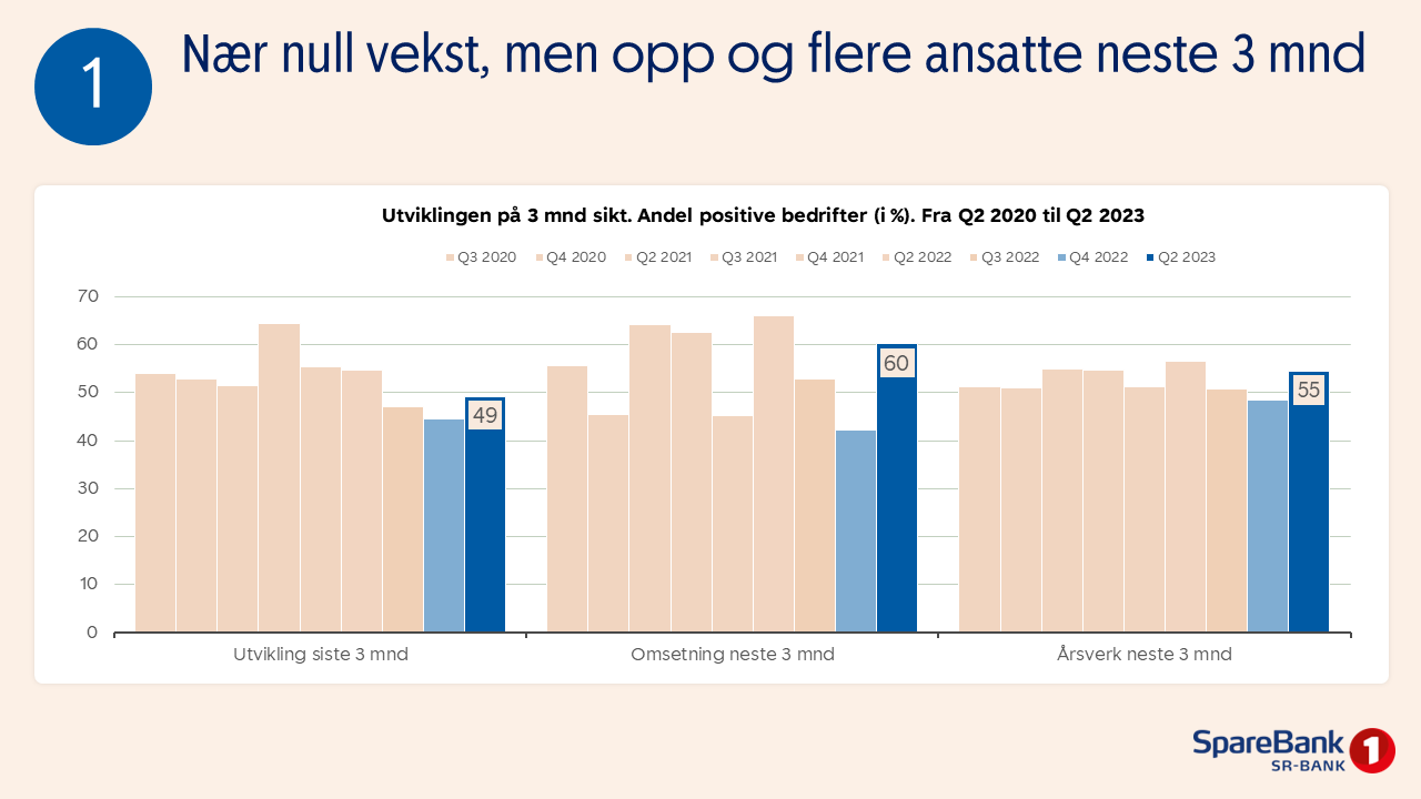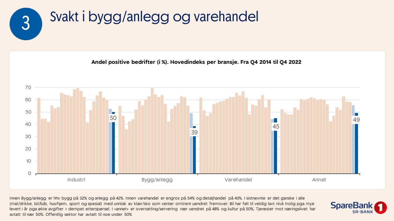 Hovedindeksen er fortsatt positiv, og har økt fra forrige gang, noe som betyr at flertallet av bedriftene venter vekst det kommende året. Det innebærer forventninger om flere ansatte, økt omsetning og en større ordrereserve. Samtidig merker vi oss at næringslivet fortsatt er tilbakeholdne med investeringer. Når det gjelder bransjer, er varehandelen den bransjen med størst optimisme. Det er verdt å merke seg at det er mindre bransjeforskjeller nå enn tidligere. Det går også i riktig retning for bygg og anlegg, etter en lengre periode med nedgang.