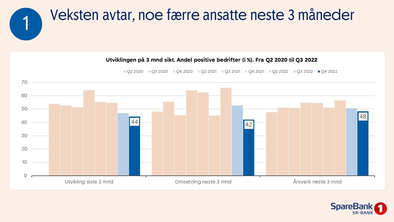 Vi har spurt til sammen 1050 bedriftsledere i Vestland, Rogaland, Agder, Telemark, Buskerud, Vestfold og Stor-Oslo om hvordan de forventer at utviklingen blir for bedriften de neste 12 månedene. Undersøkelsen dekker omtrent to tredeler av norsk næringsliv.