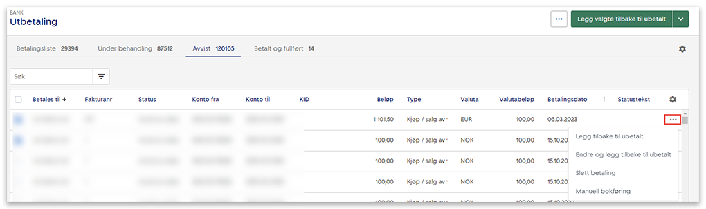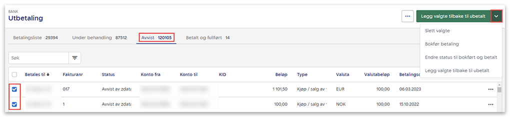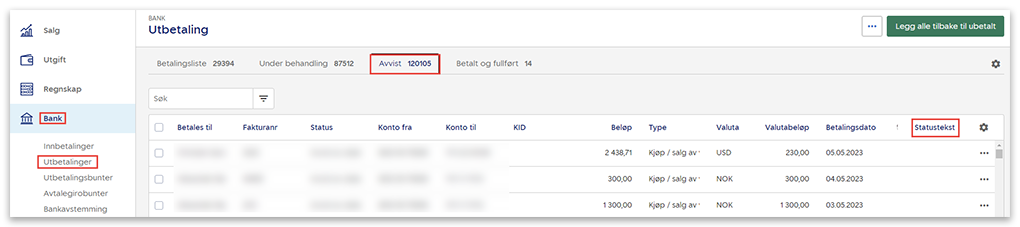 I feltet Statustekst får du vanligvis en indikator på hva som har feilet, for eksempel feil/ugyldig KID, manglende godkjenningsrettigheter i banken, eller at betalingen er slettet manuelt. Dersom du ønsker å legge alle de avviste betalingene tilbake i betalingslisten klikker du på Legge alle tilbake til ubetalt.