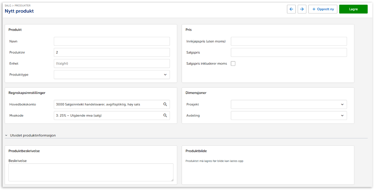 2. Fyll ut informasjon om produktdetaljer, pris, regnskapsinnstillinger og eventuelle dimensjoner og velg Lagre. Hvis du lar feltet under Produktnr stå blankt vil systemet autogenerere det neste ledige nummeret etter det høyeste eksisterende produktnummeret.