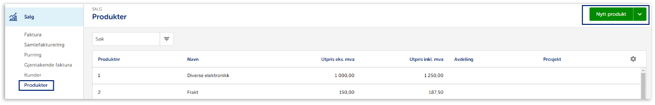 1. Gå til Salg i venstremenyen og velg Produkter. Klikk på pilen, velg Importer produkter for å importere produkter gjennom filopplasting. Klikk på Nytt produkt for å opprette et nytt produkt manuelt.