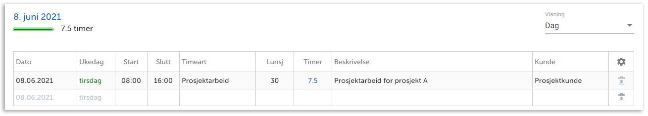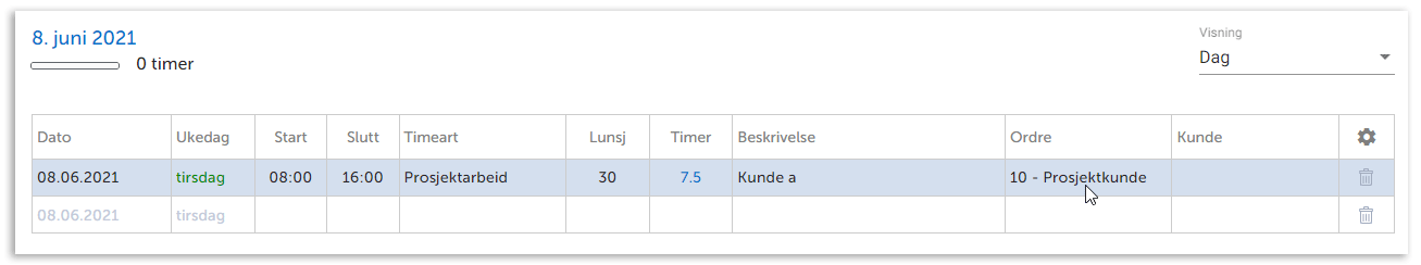 Registrer timer, legg inn dato, klokkeslett, timeart og velg kunde. (Dersom du ikke får opp feltet kunde, trykker du på tannhjulet, hak av for kunde og trykk lagre)