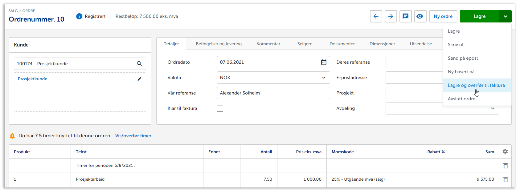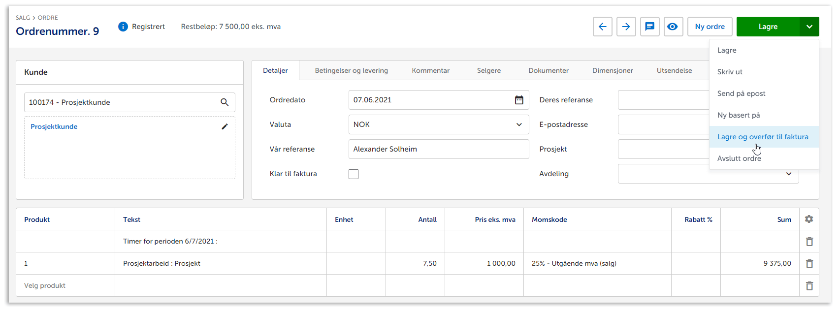 Velg orderen du har laget og trykk på den Grønne pilen og velg Lagre og overfør til faktura, trykk Overfør.