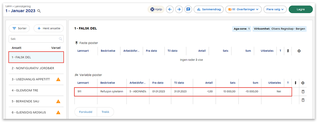Benytt systemets standard lønnsart 911 Refusjon sykelønn (med ekstra 5% aga) når du fører refusjon for arbeidsgiveravgift på sykepenger påløpt i 2024. Når du skal føre refusjon for arbeidsgiveravgift på sykepenger påløpt i 2025 kan du benytte lønnsart 910 Refusjon sykelønn (aga), dette er fordi 5 % ekstra arbeidsgiveravgift avvikles fra og med 01.01.2025.