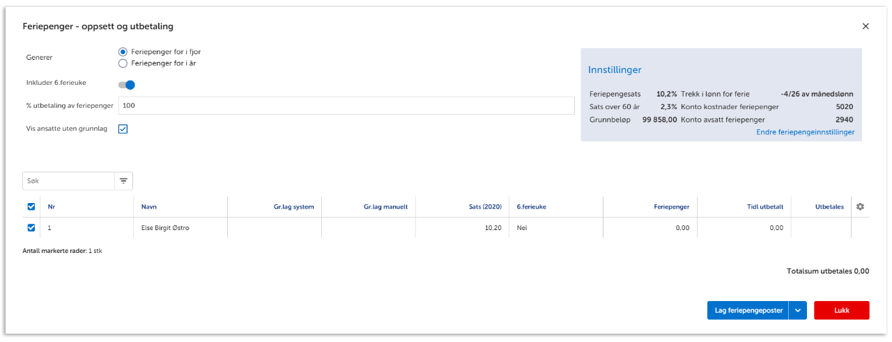 5. Sett hake ved de ansatte du skal utbetale feriepenger for og klikk på Lag feriepengeposter