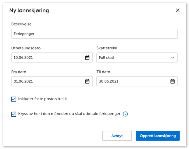2. Velg Ny lønnskjøring og sett hake ved Sett hake her i den måneden du skal utbetale feriepenger. Fyll inn feltene og klikk på Opprett lønnskjøring